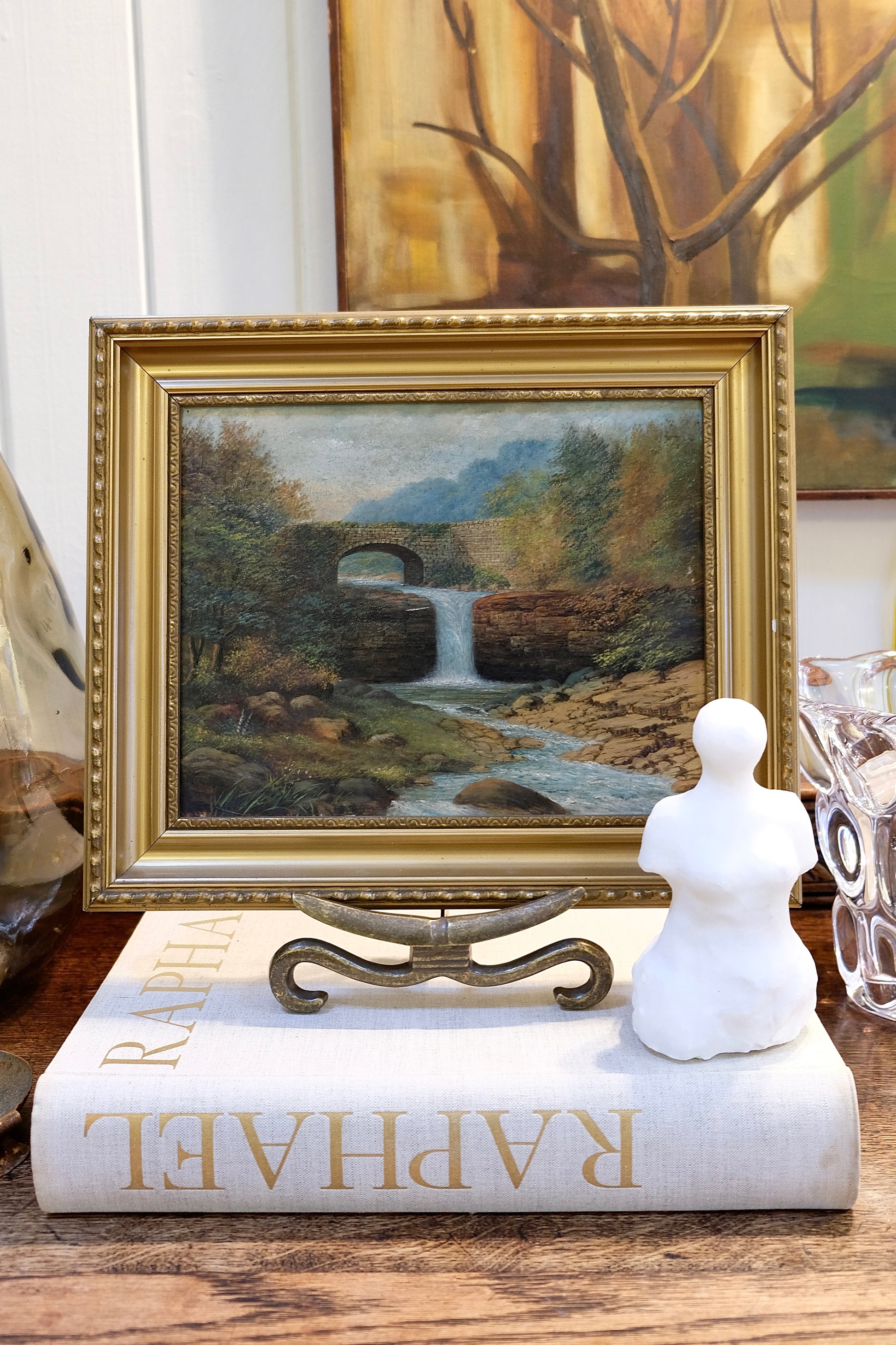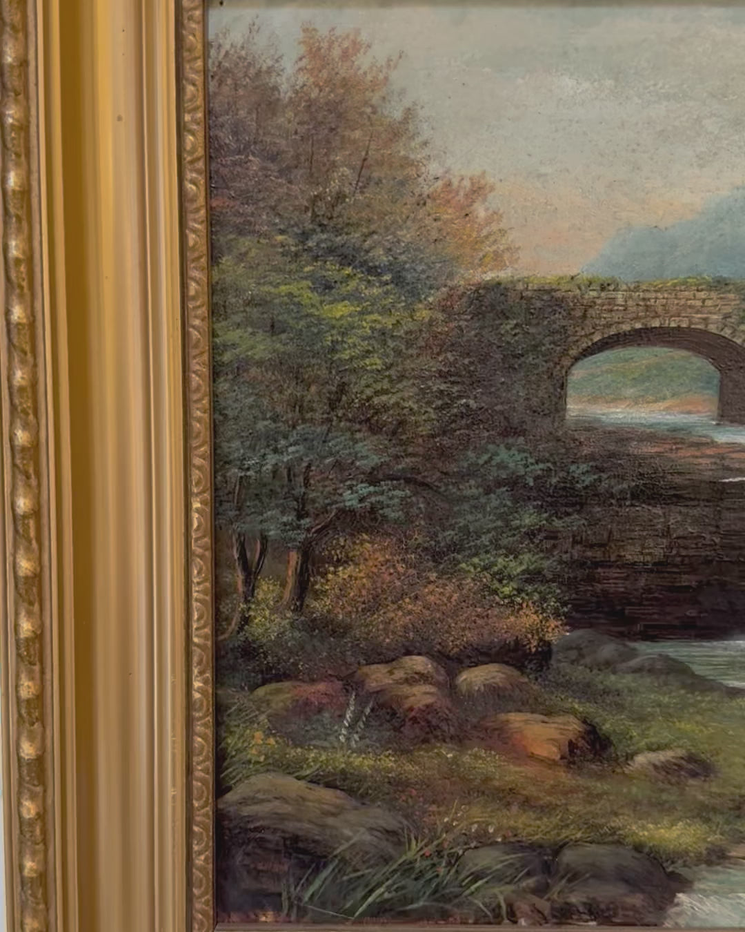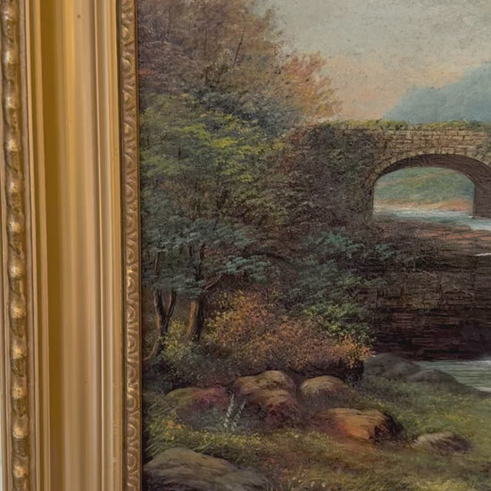 Antique or Early Vintage Oil Painting of a Serene English River with Small Falls. This canvas captures the beauty of a running river under a charming bridge, framed by early fall leaves and a lovely riverbed. The colors are vibrant yet soothing, with beautiful movement in the water that almost brings it to life. ππ