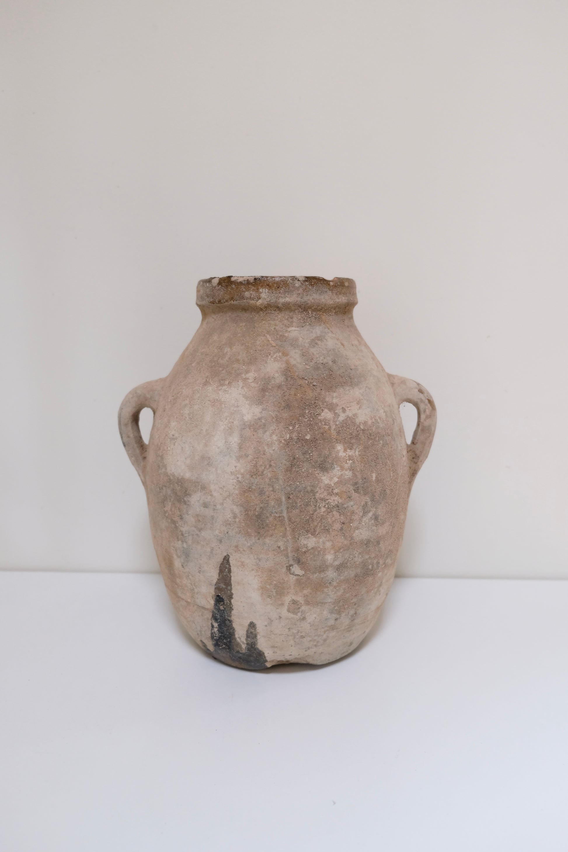 An incredible antique Turkish clay jug with two handles and the best dusty crusty Mediterranean patina. These old handcrafted vessels were traditionally used for storing water or olive oil and today make stunning sculptural decor pieces. The surface wear, clay texture, and glaze remnants all speak to its age and history. Beautiful styled on the floor, on a low table, or filled with branches.