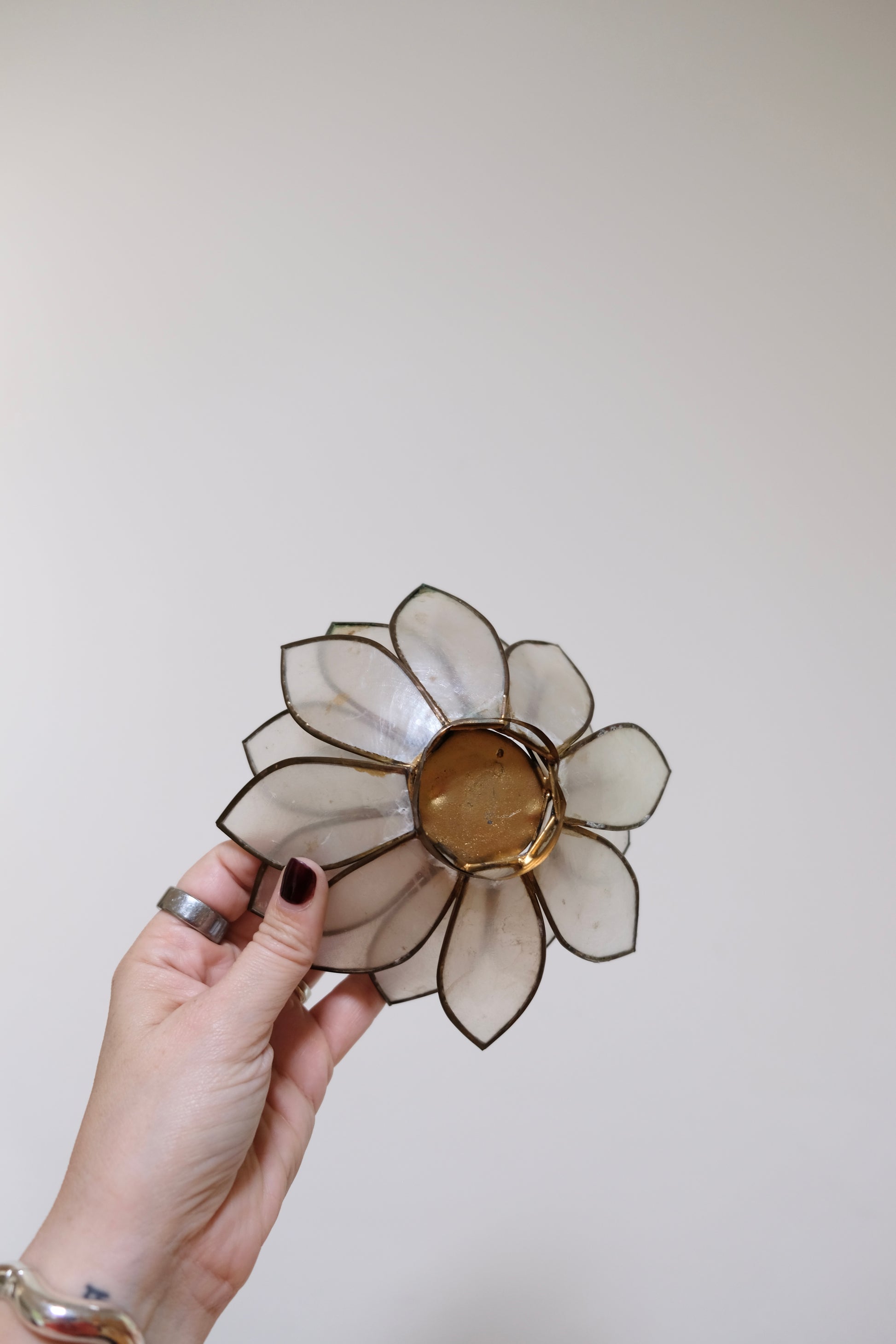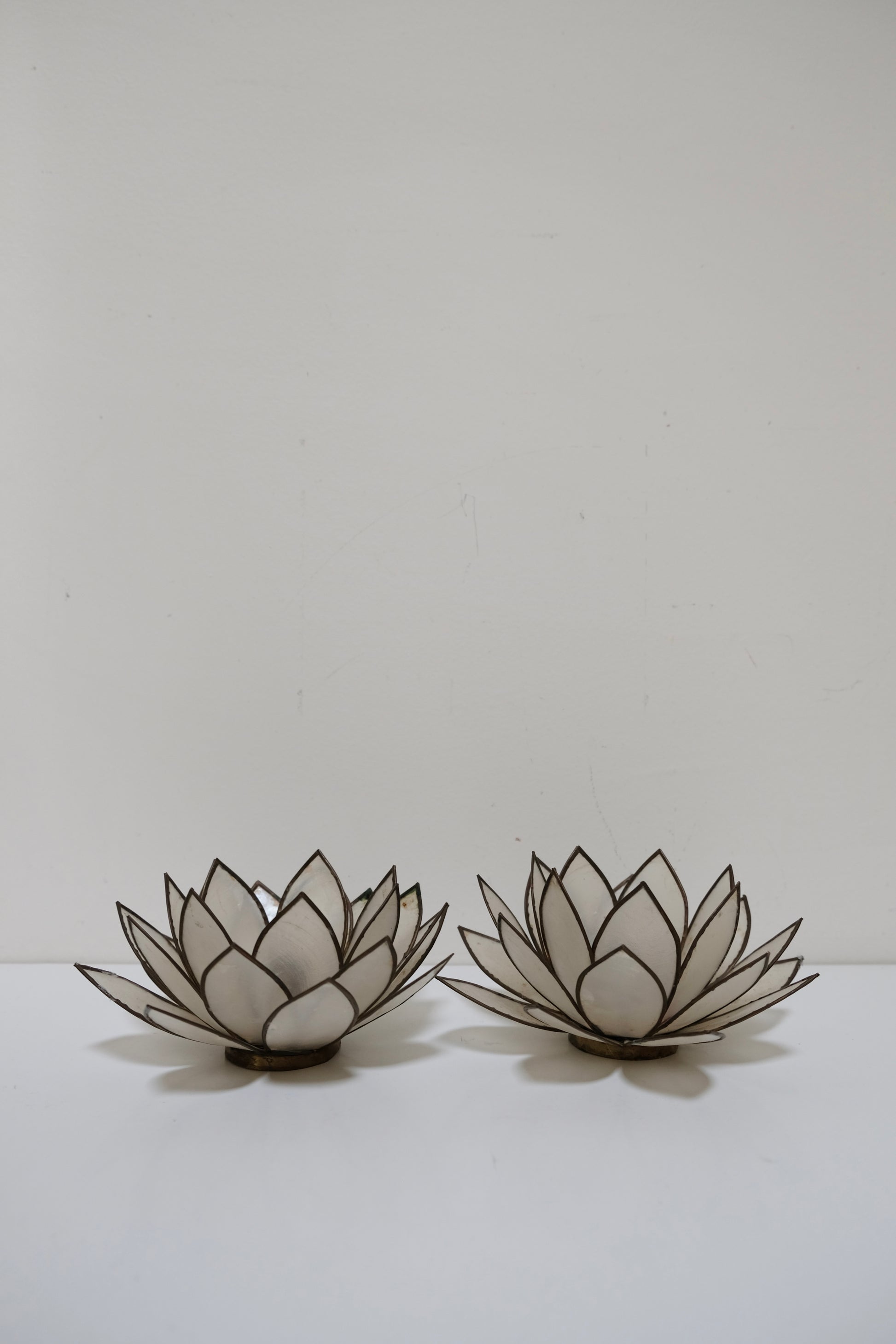 Pair of Vintage Capiz Shell Floral Candleholders – Glowy, ethereal petals framed in brass, perfect for thin tapers. These catch the candlelight beautifully and add instant mood. 6” x 3”