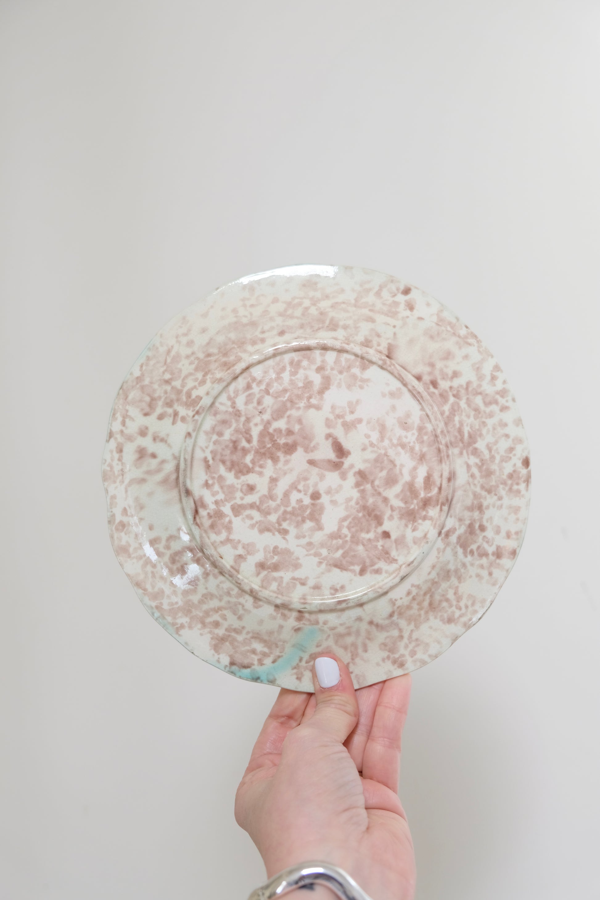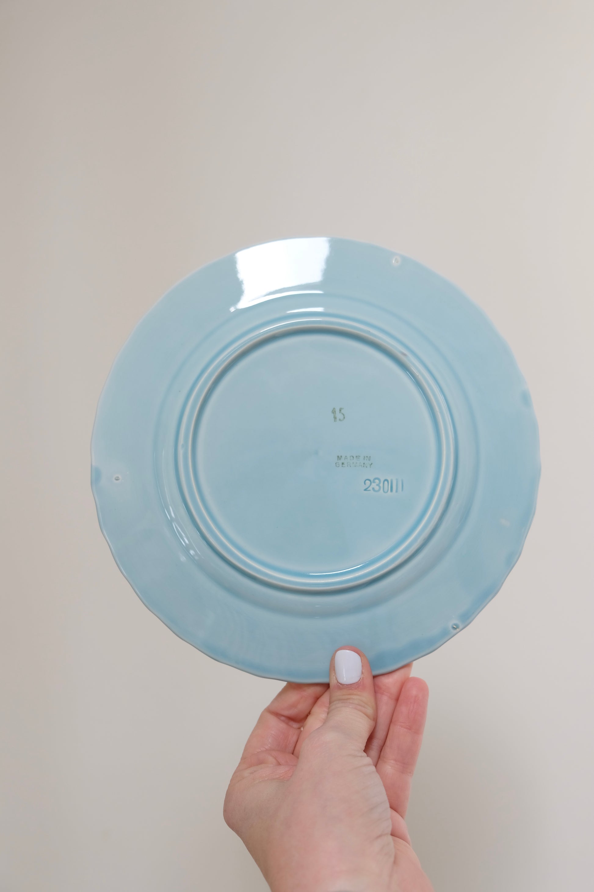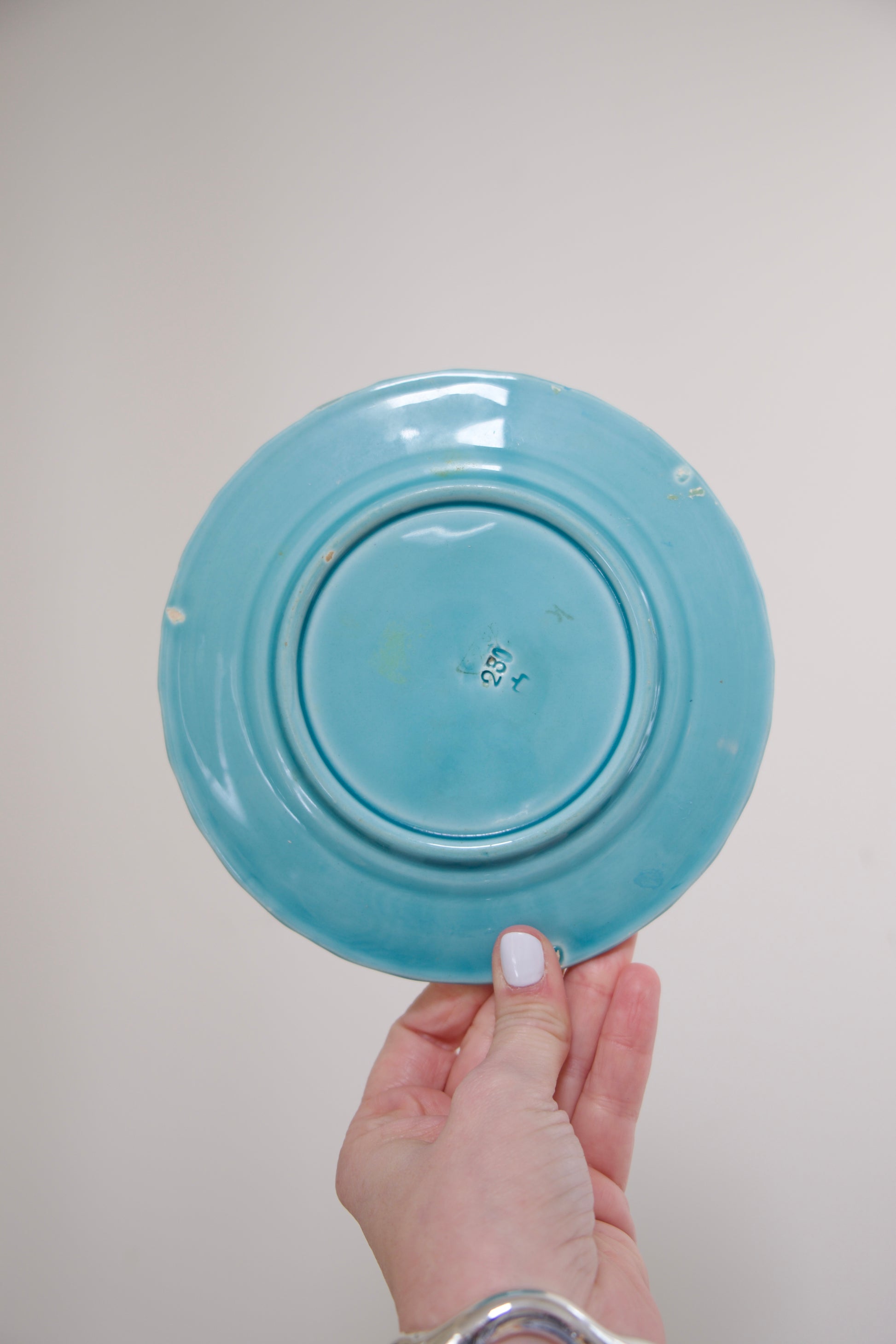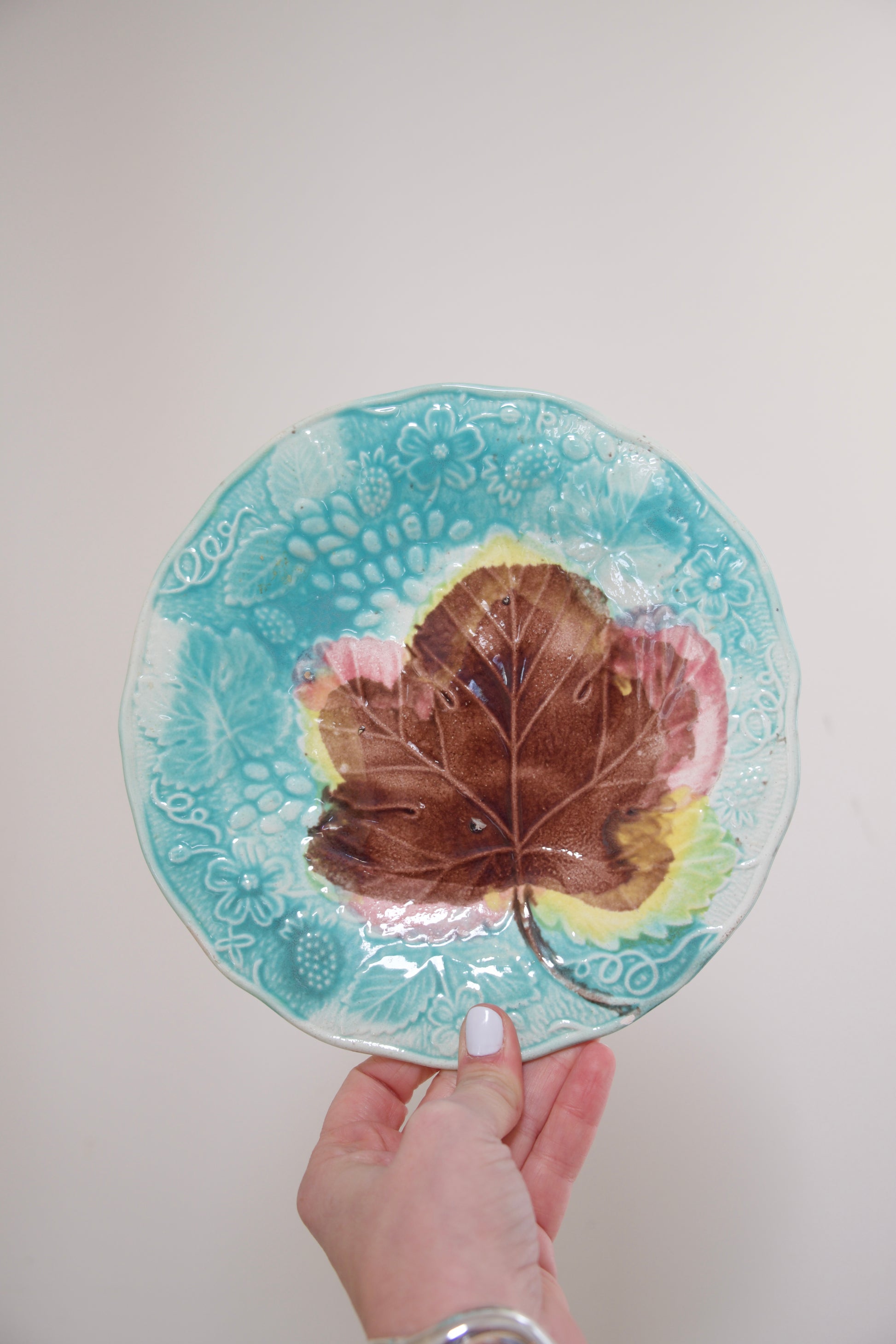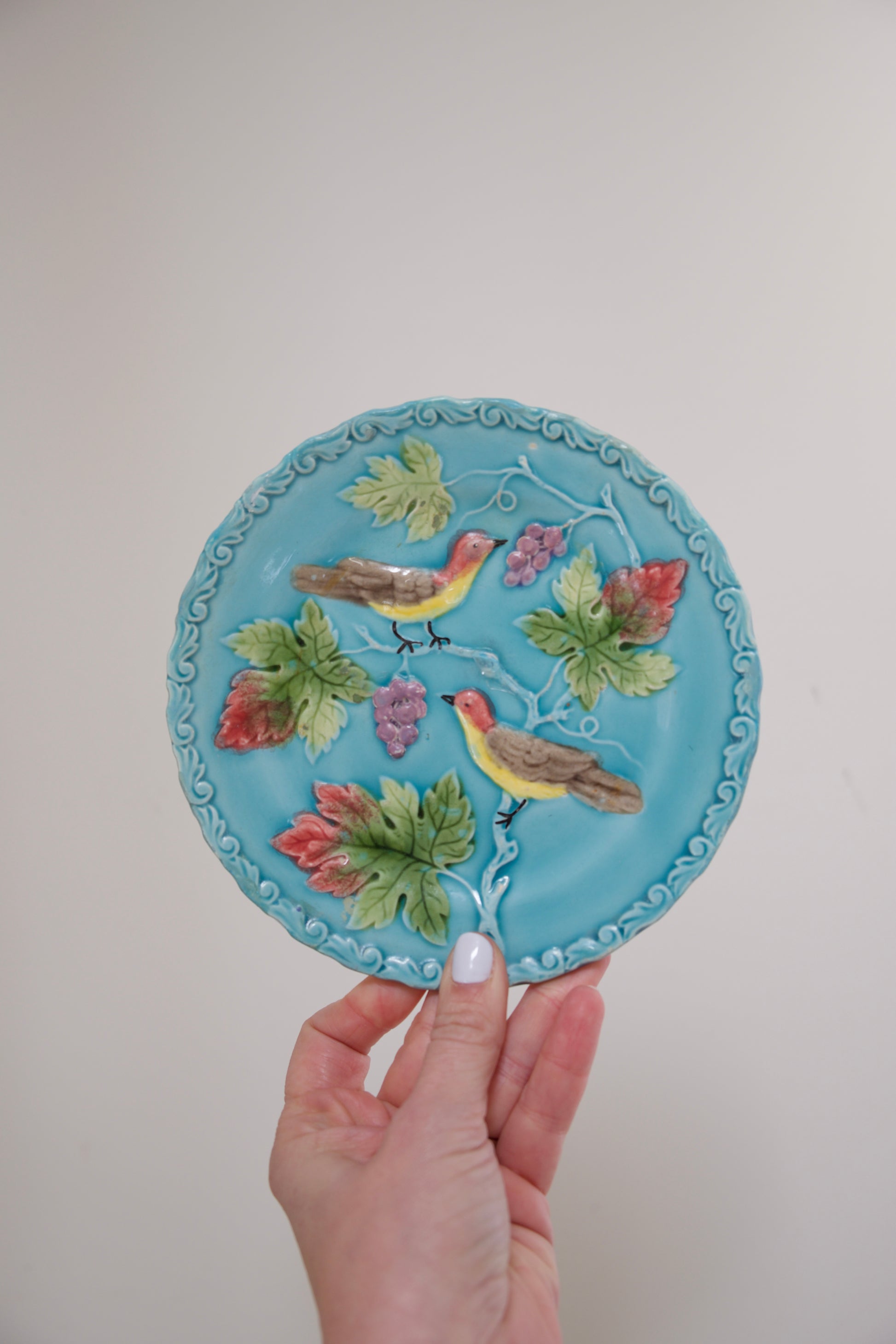 Set of 3 Antique German Majolica Plates. A stunning mix of vibrant turquoise blues and detailed motifs. Two plates feature sweet birds perched among vines and grapes, while the third is a heavier design with a leaf pattern and speckled back. These pieces are just so special. Sizes: 6.5”, 7.75” and 8”.