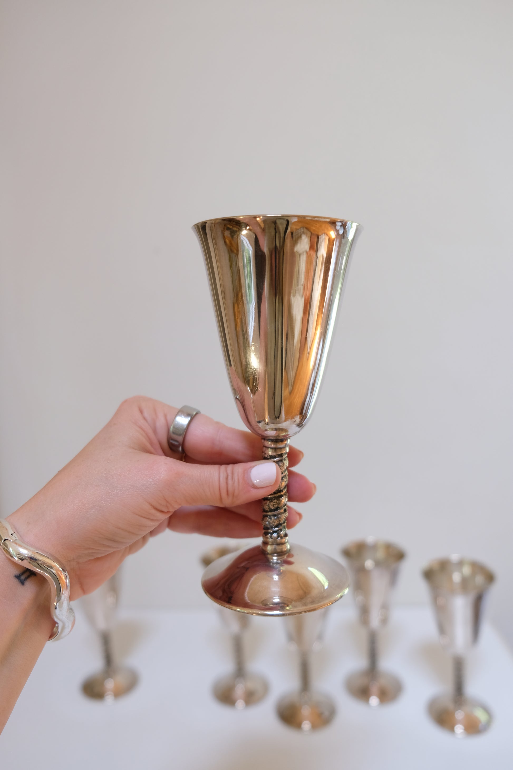 Elegant goblets with twisted stems and a silver-plated finish, stamped Sevilla, Spain. Perfect for entertaining or styled as a bar cart accent. I love these! 6.75” x 3”