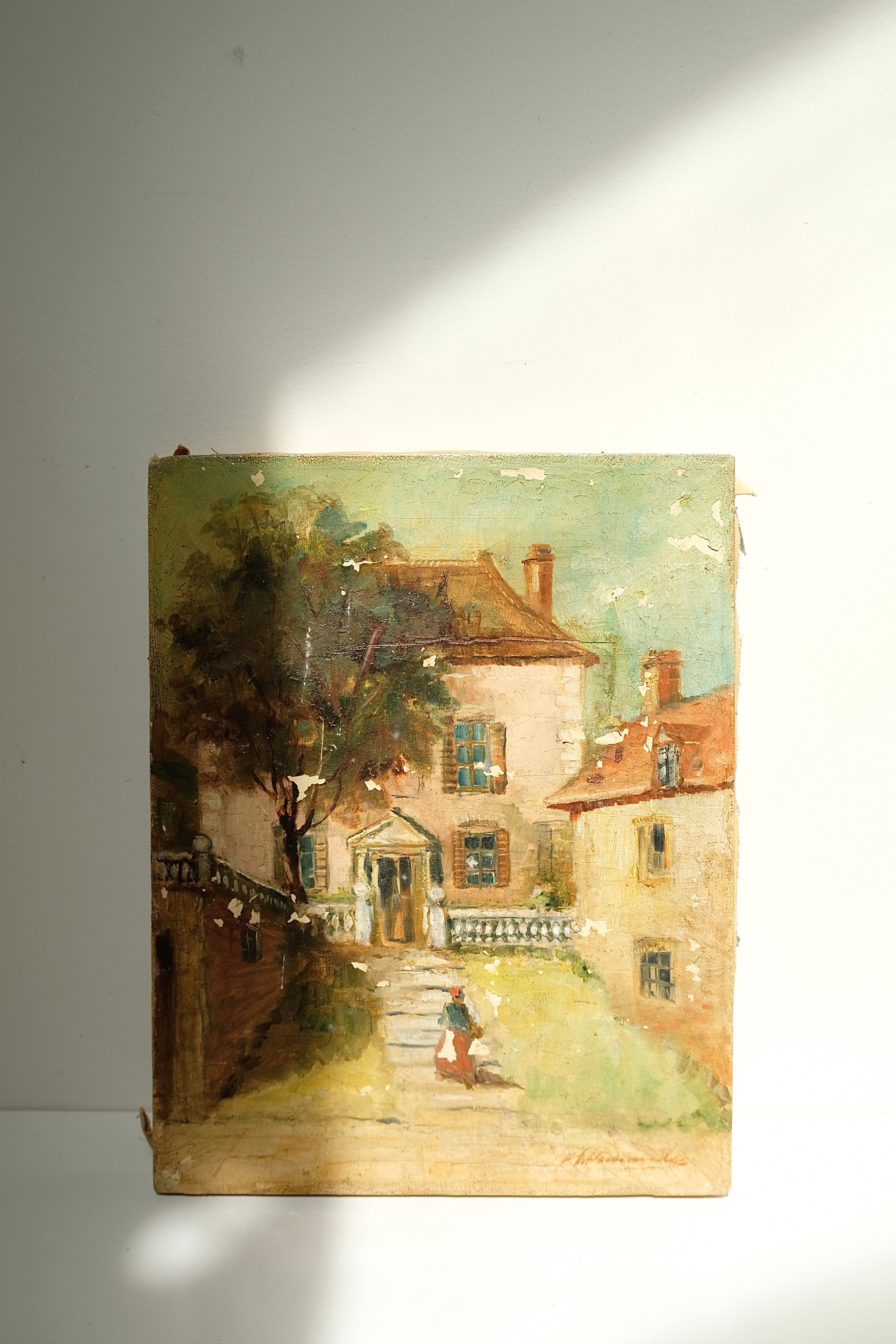 A soulful and weathered oil painting, patched on the back and full of all the perfect imperfections that give it life. Found in a Connecticut barn, it depicts a stately home façade with a figure ascending the steps, framed by trees and warm architecture. Chippy, aged, and oh-so-inviting for anyone who loves rustic, storied finds.