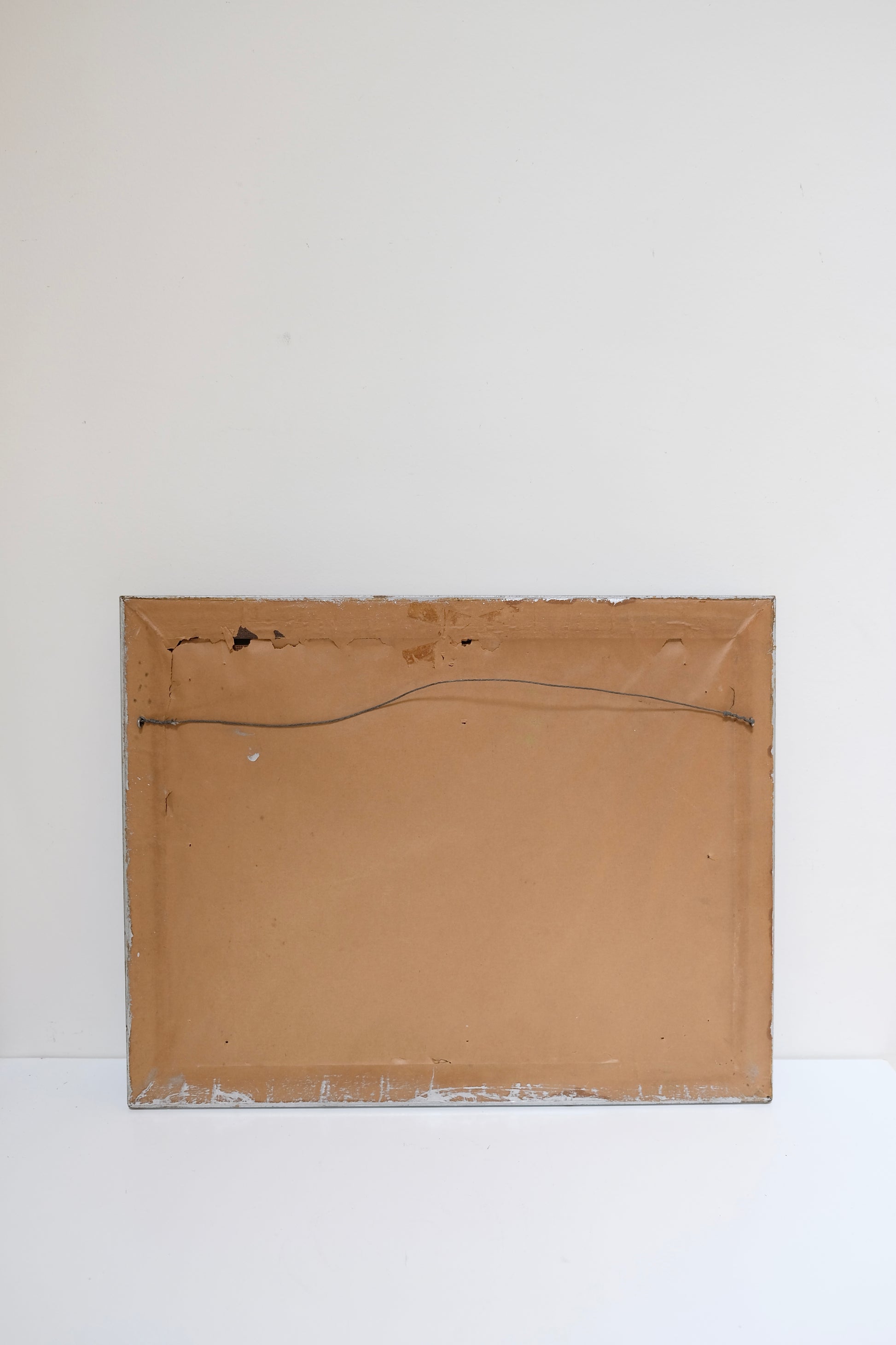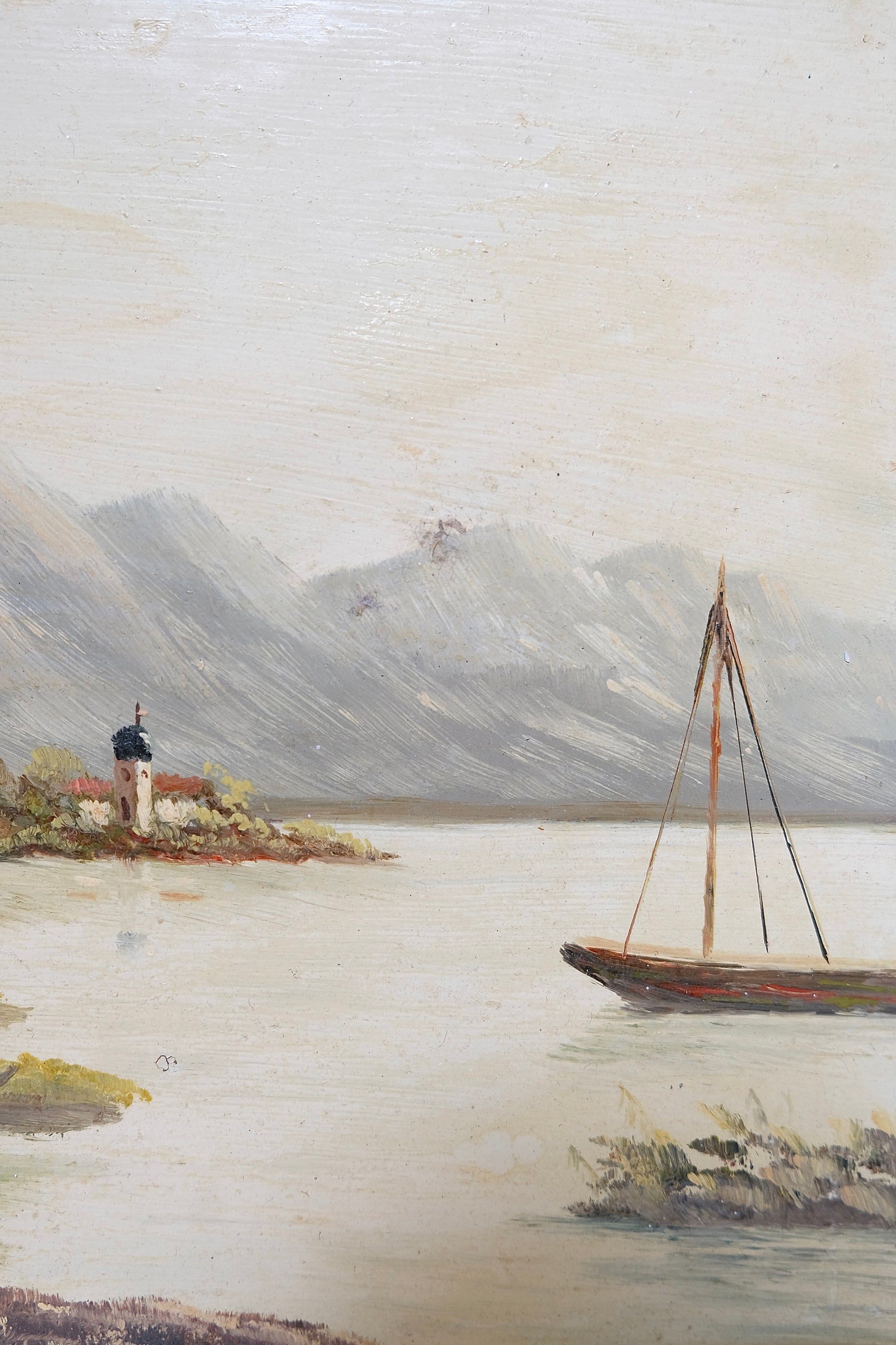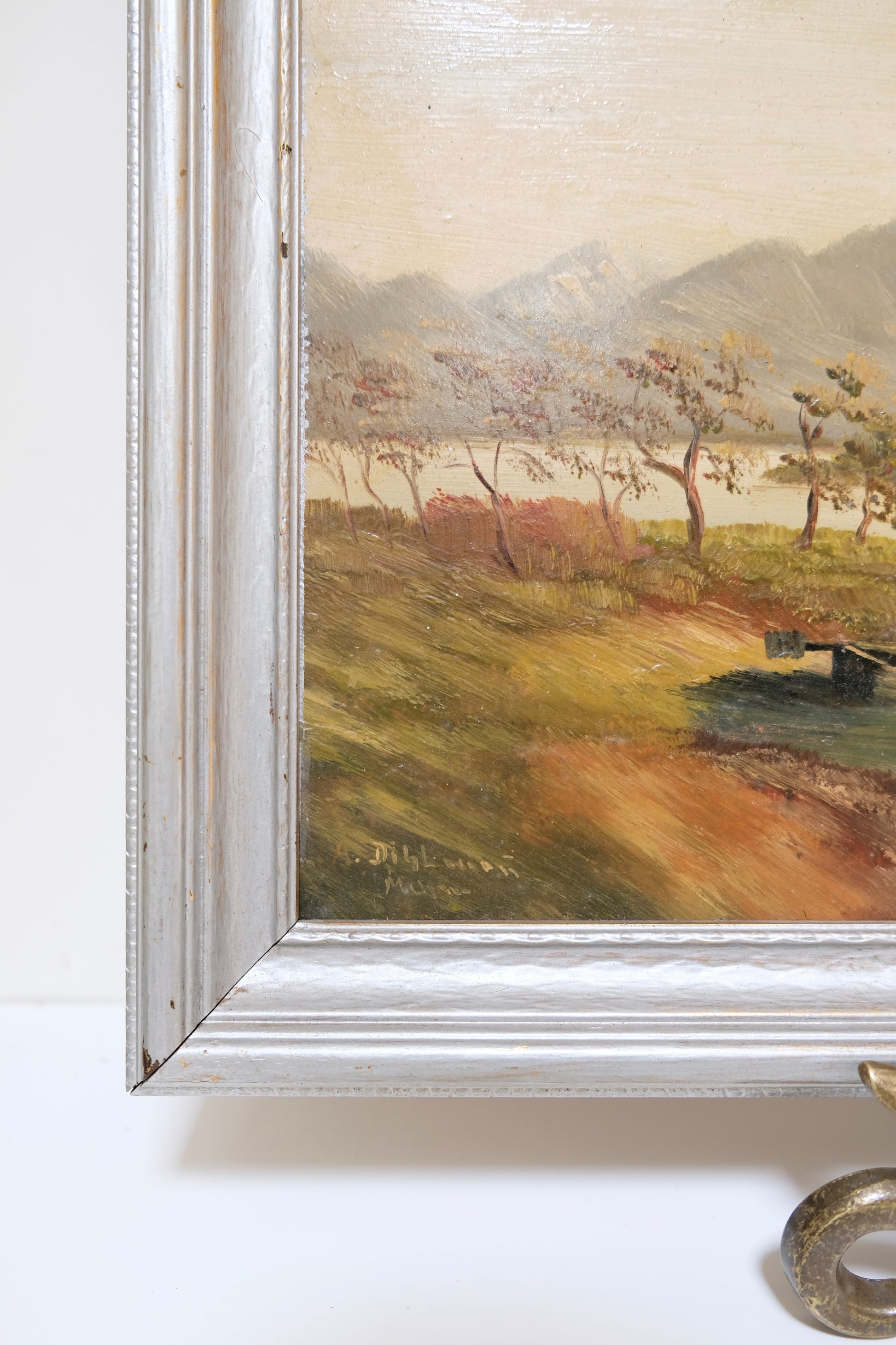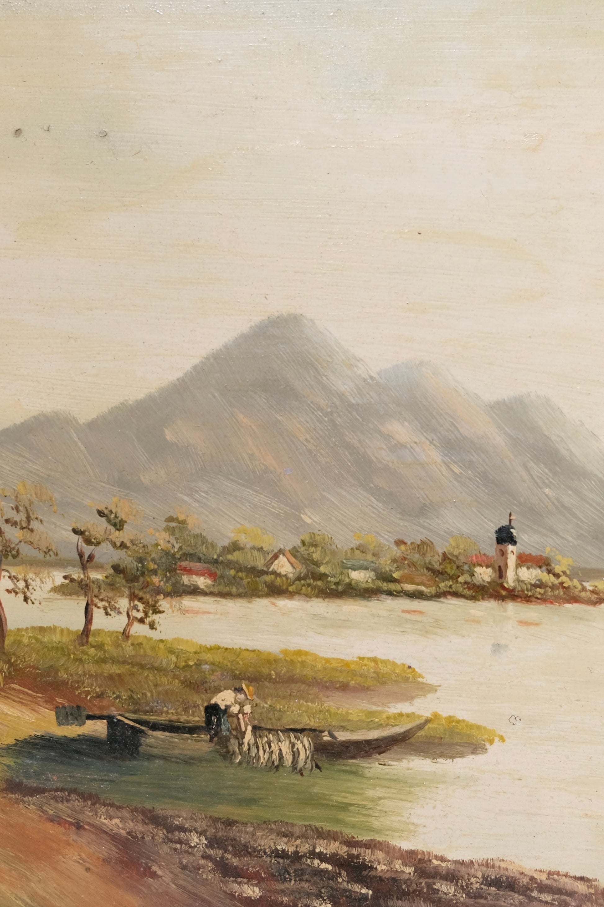 This vintage beauty captures a tranquil lakeside scene with sailboats, a lighthouse in the distance, and soft mountain backdrops. The brushwork has such charm—notice the tiny details like the fisherman tending his boat along the shore. Signed by the artist in the lower left and framed in silver-toned wood, this piece feels equally at home in a coastal cottage or a collected, eclectic gallery wall.