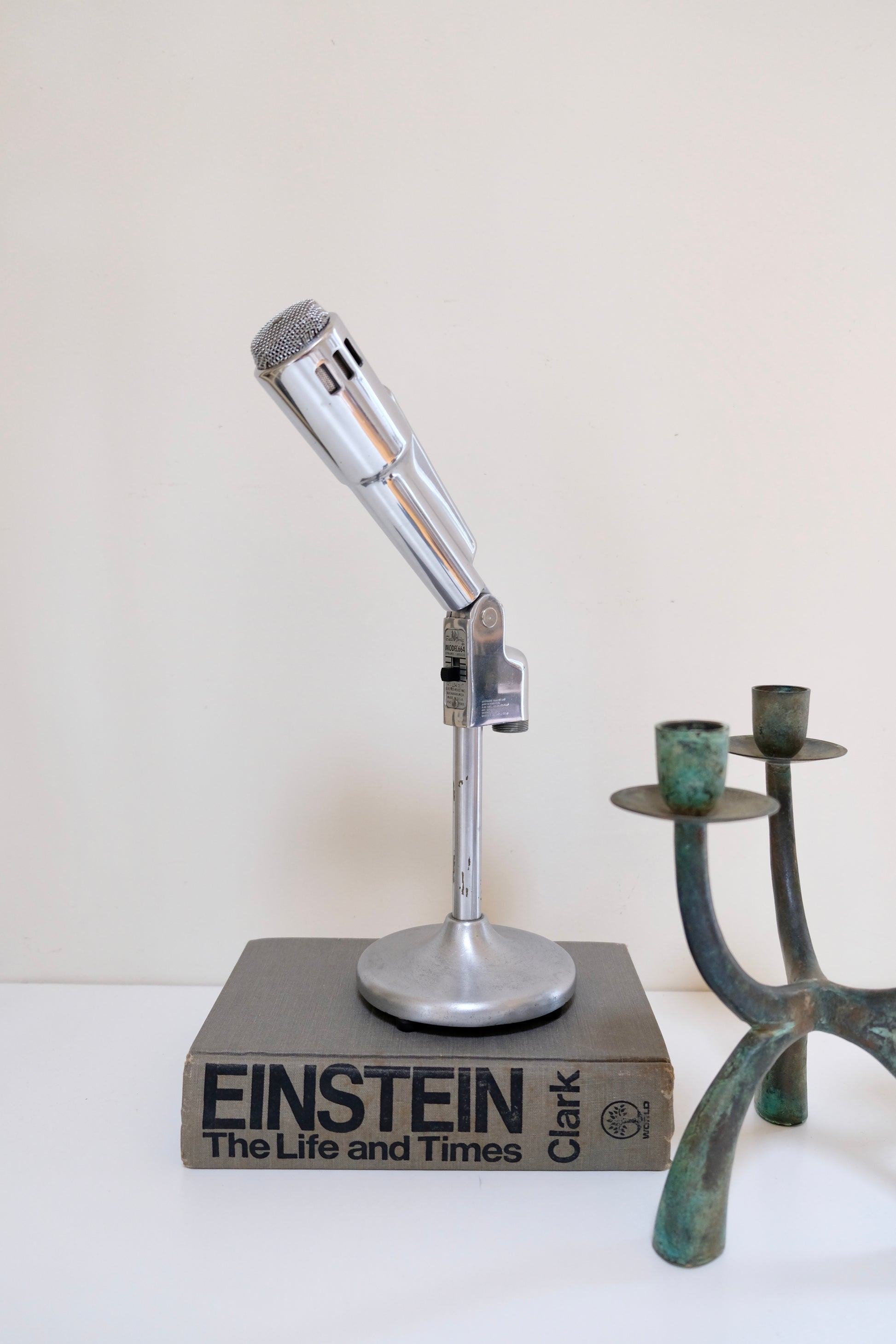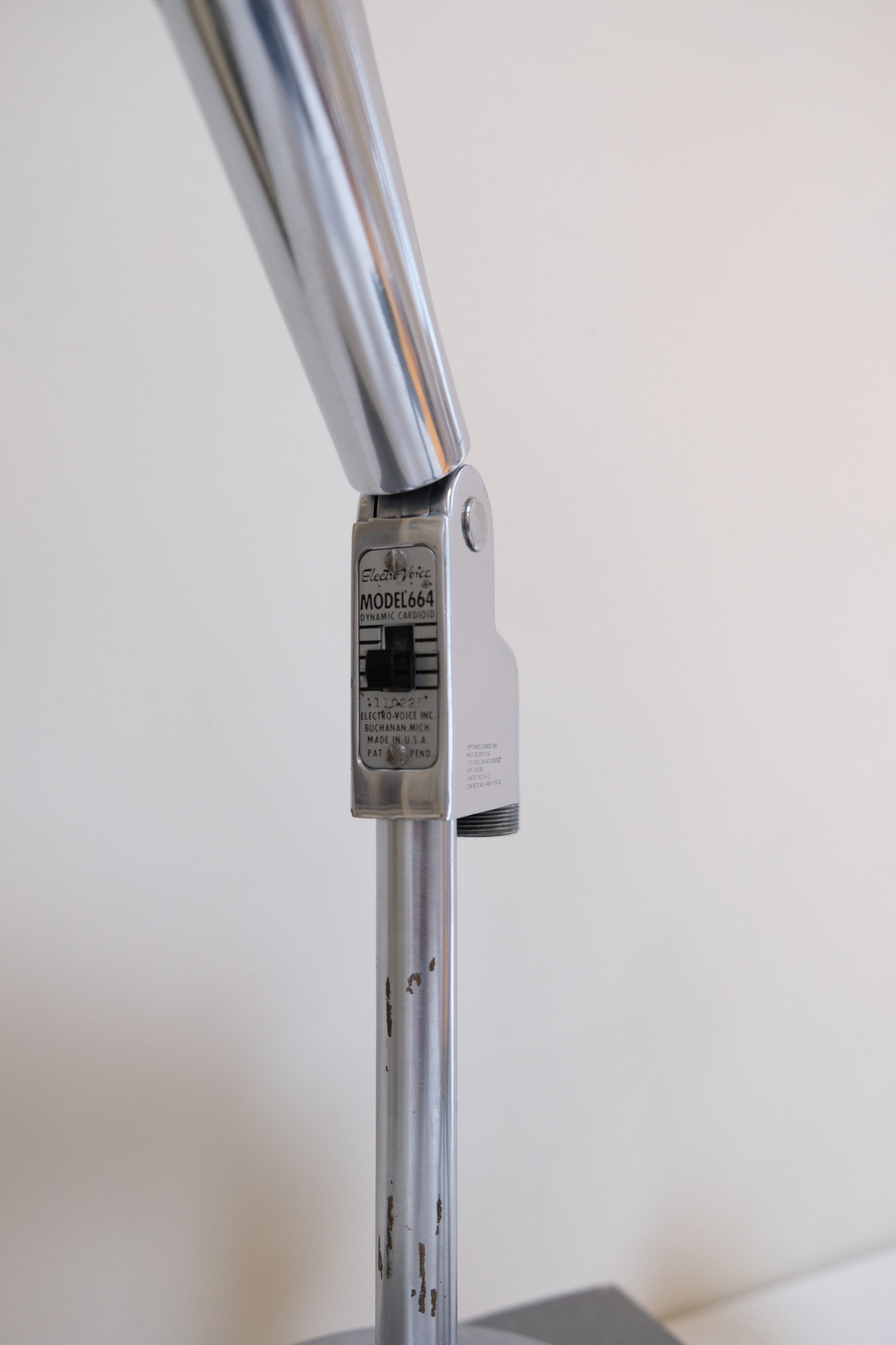 Vintage 1950s Electro Voice Microphone, Model 664, with its attached stand. This piece is in working condition and is seriously one of the coolest items—perfect for collectors or adding an industrial edge to your decor.