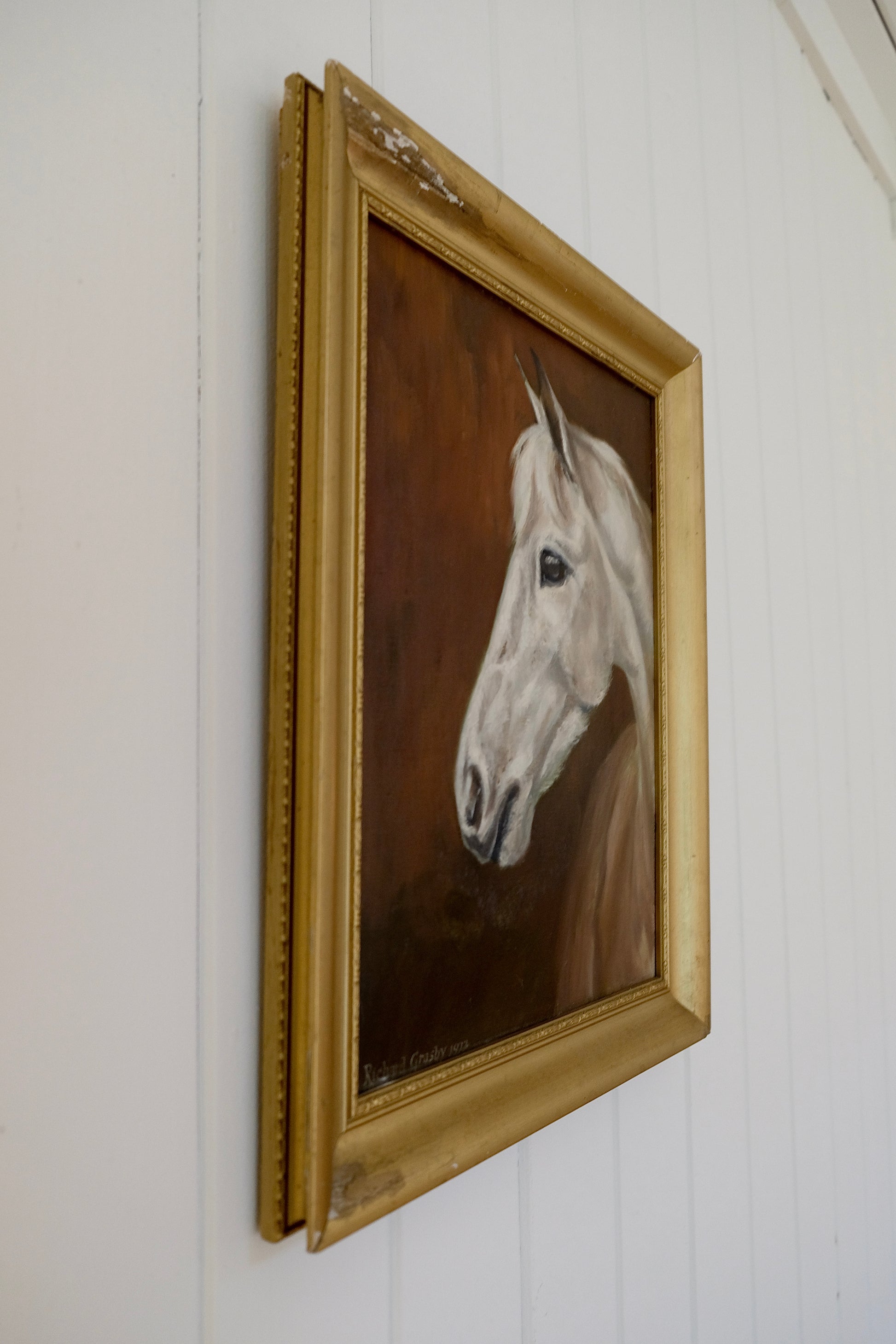 From the estate of an old horse farm, this signed 1972 oil painting captures a horse mid-graze under an open sky. The layered brushwork and muted tones bring a nostalgic calm to any space. Some warping to the board and gentle wear to the frame, both consistent with age and adding to its charm.