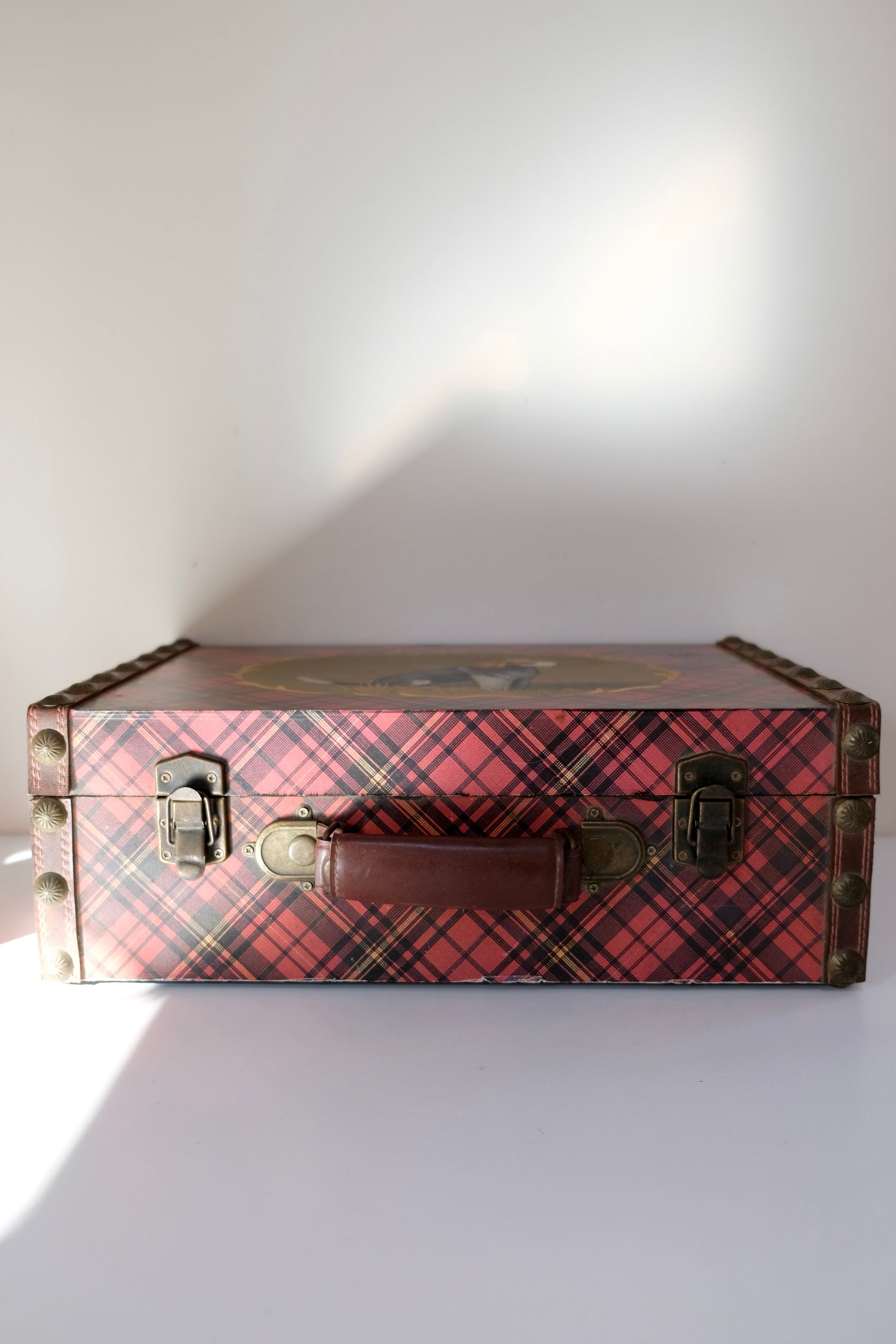 This one feels straight out of a cozy English study β a vintage tartan case with a hand-painted sporting dog on top πΎ. The red plaid exterior is trimmed with brass hardware and stud details, while the interior is lined in deep wine velvet. Itβs both decorative and functional β perfect for storing keepsakes, holiday cards, or displaying under a console or beside the hearth.