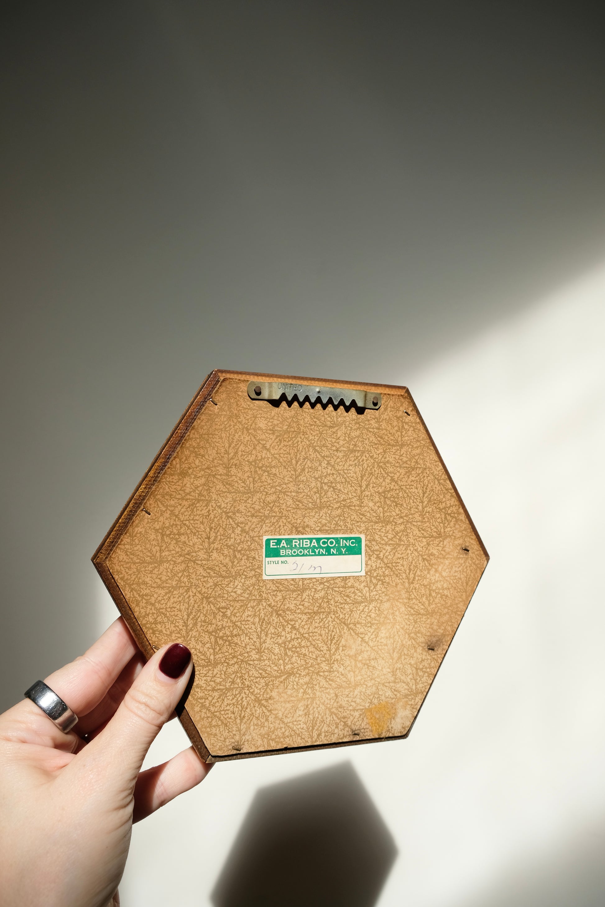E. Octagon Mirror – Maker’s stamp E.A. Riba Co., Brooklyn NY. 6.5” x 7.5”, so good for mixing shapes. $38 + ship