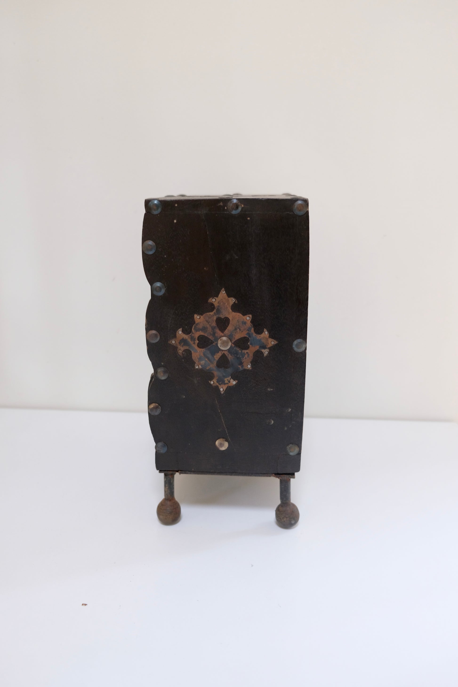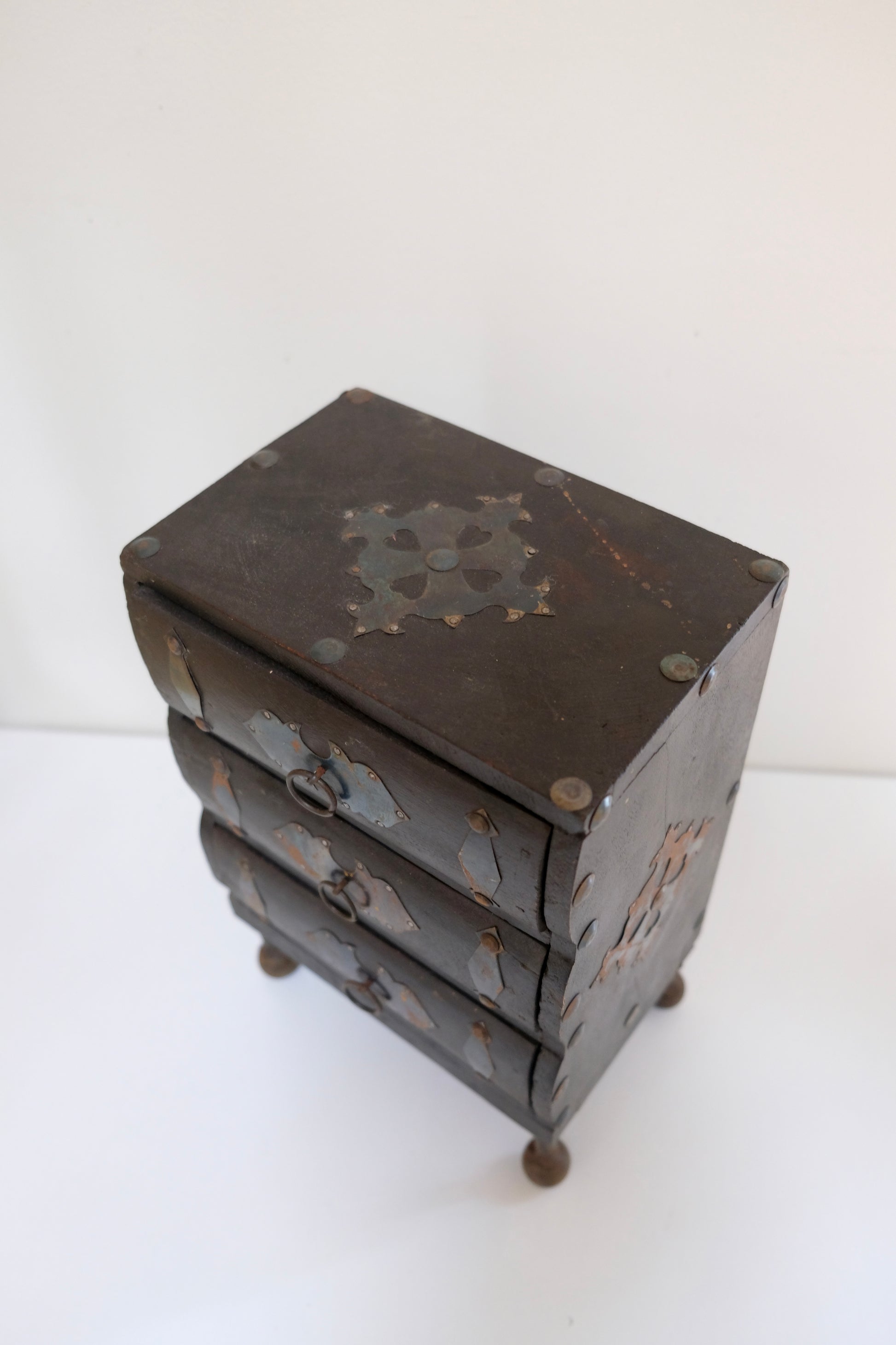 An incredible mini dresser with three working drawers, ball feet, and hand-applied metal detailing. The patina on the metal and the deep wood tone give it so much old-world character. Perfect for jewelry, desk storage, or simply styled as an eye-catching accent on a shelf or console.