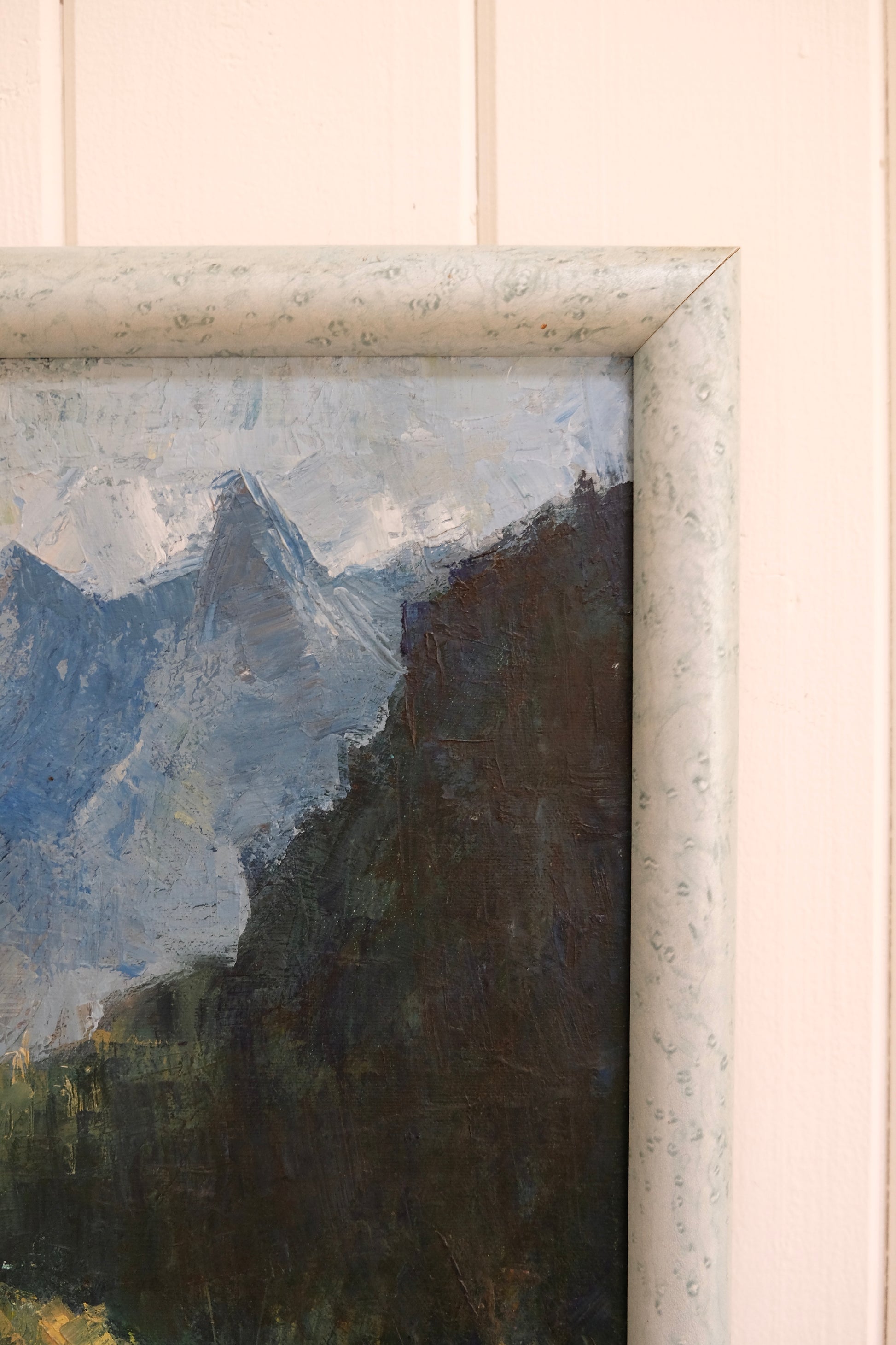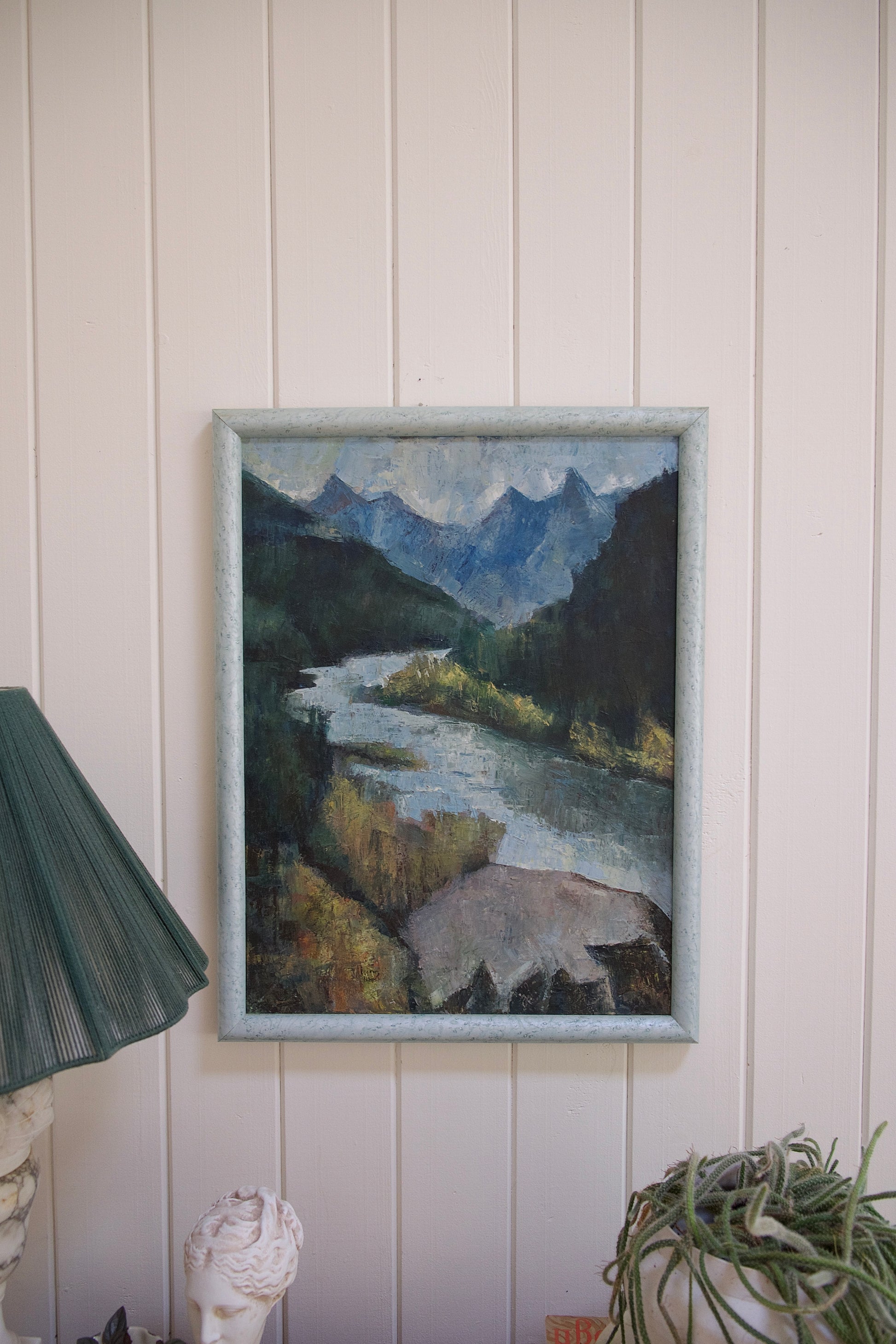 This vintage original oil painting captures a serene mountain river scene with rich texture and incredible depth of color. The moody blues and greens pull you in — you can almost feel the cool air and stillness of the landscape.