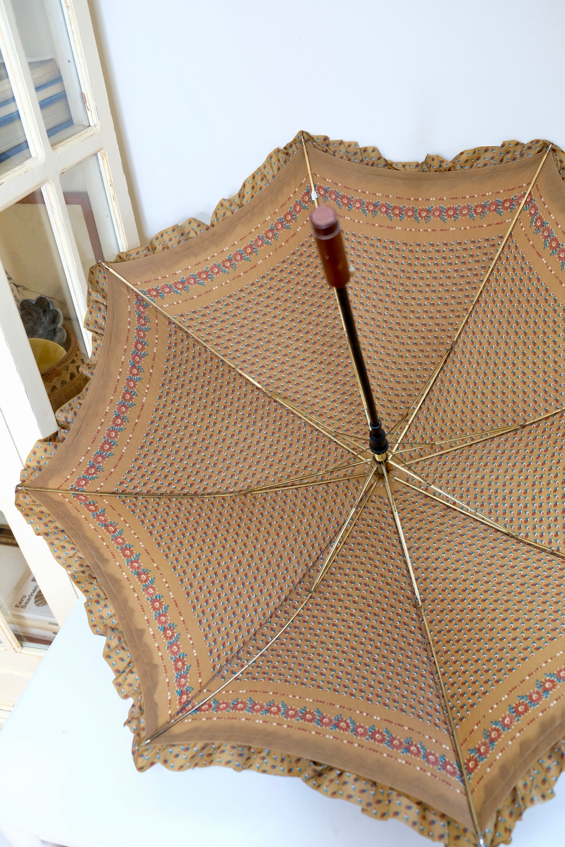 Adorable antique or true vintage brown parasol with a blue and red floral pattern and frilled edges. No rips or tears, and it stays open—both decorative and functional.
