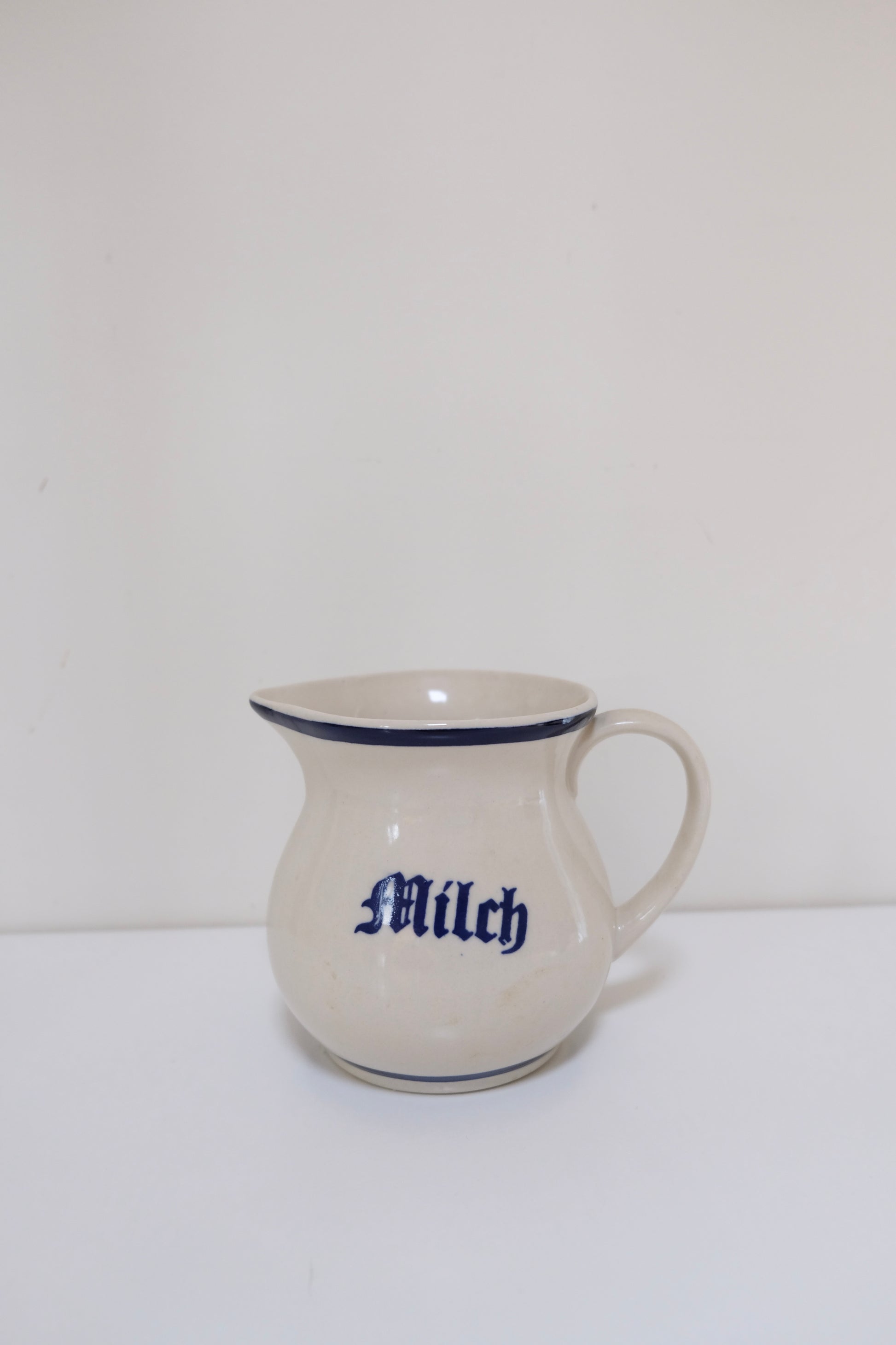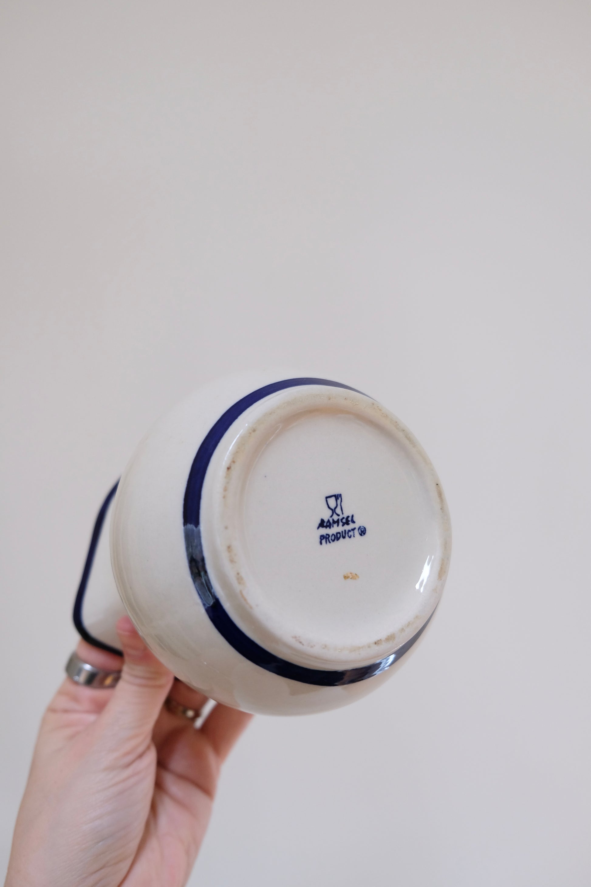 A charming vintage stoneware pitcher marked “Ramsel Product,” featuring deep blue lettering for Milch and a classic cream glaze. The shape is beautifully rounded with a slightly flared rim and simple blue banding that feels timeless. Perfect for styling with wooden spoons, holding flowers on the counter, or adding a touch of European farmhouse to your shelves.