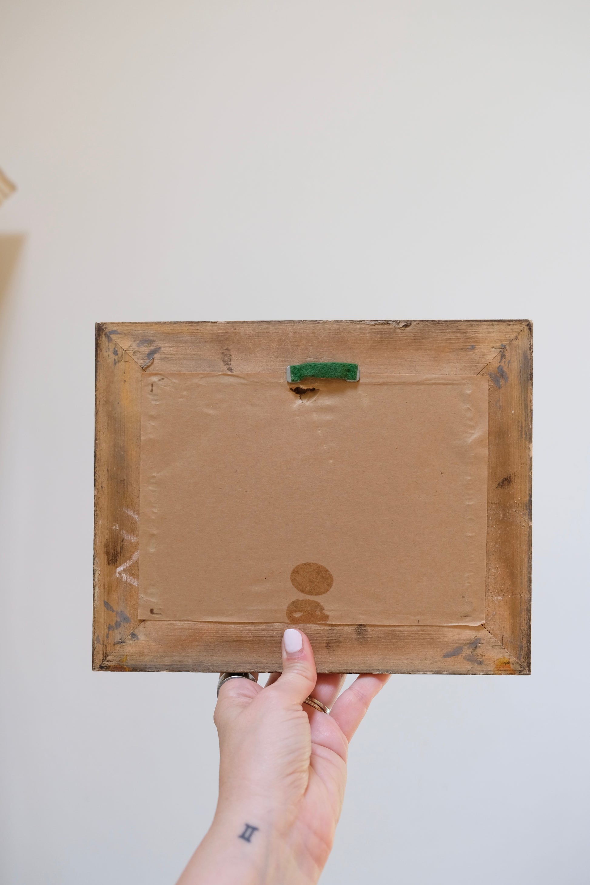 A bold and lively scene of roosters and chickens, beautifully captured in oil and set in an ornate gilt frame. I love the small size and fun nature of this piece. 10” x 8”