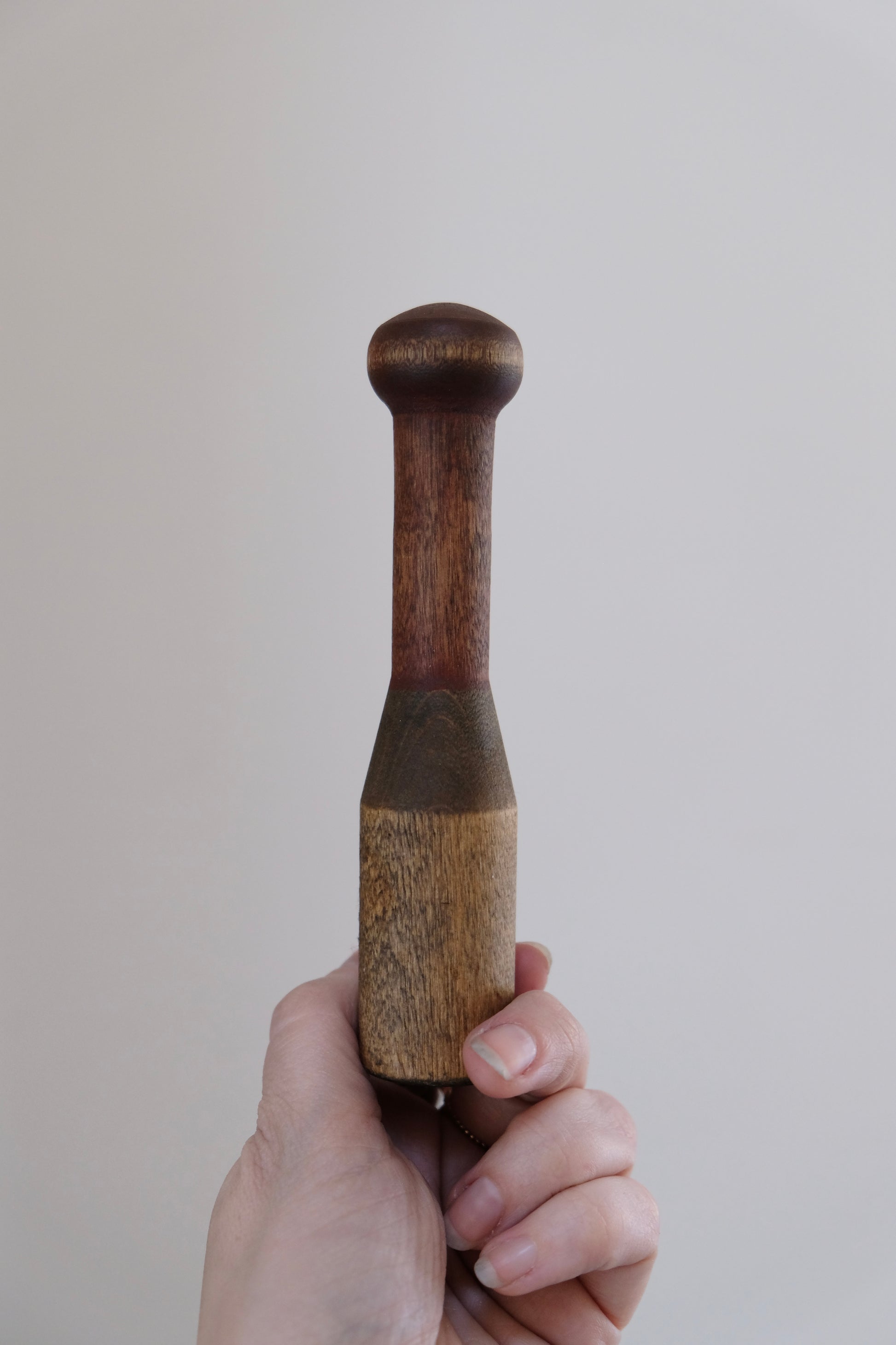 A striking checkered wooden mortar and pestle with wonderful weight and form. Sculptural even when not in use.