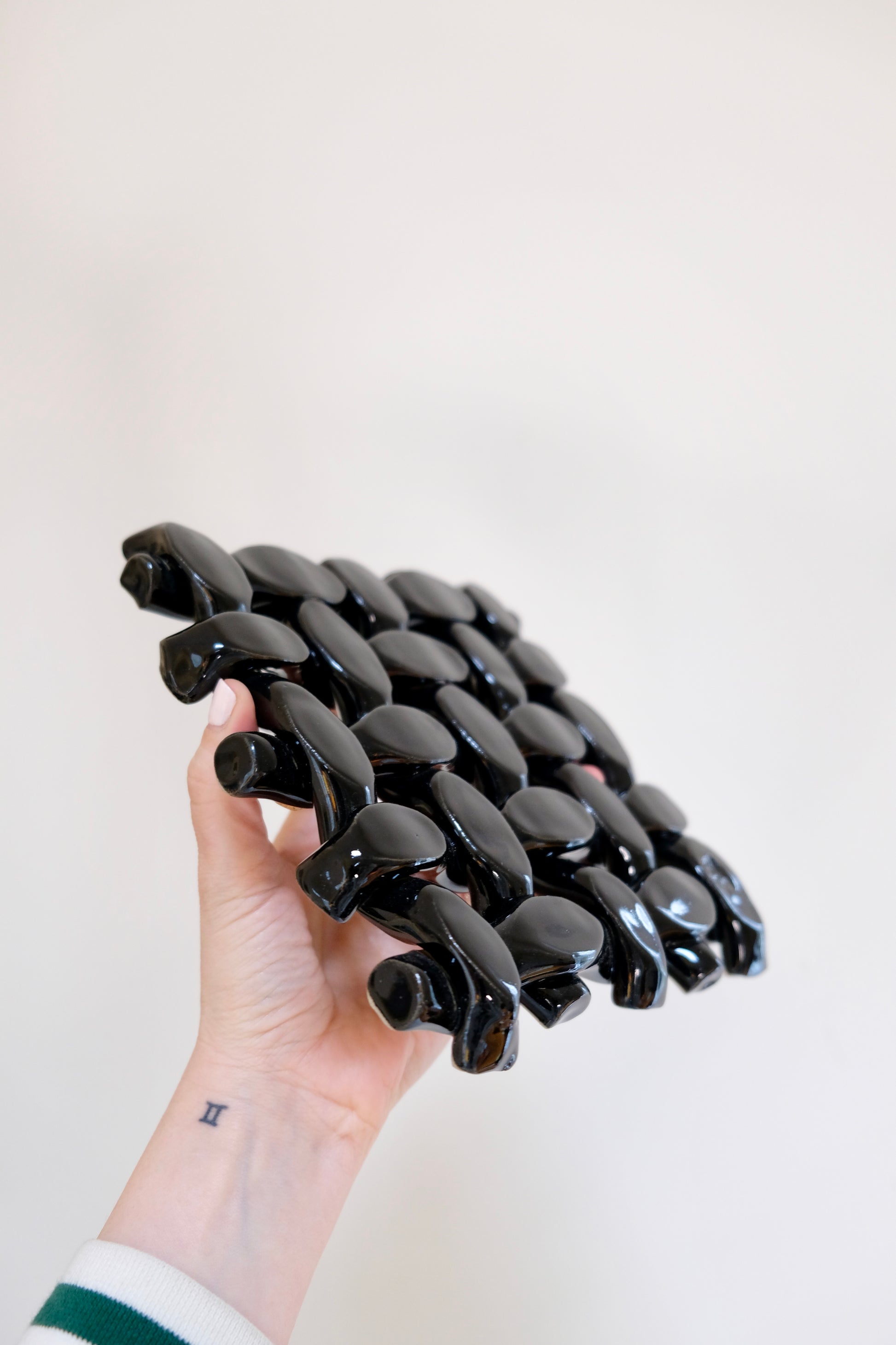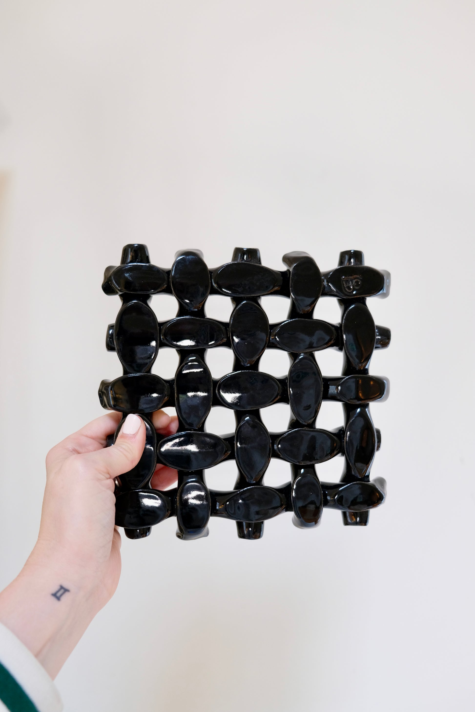 Intricately woven pottery trivet finished in a sleek black glaze. A functional and artistic piece for your kitchen.